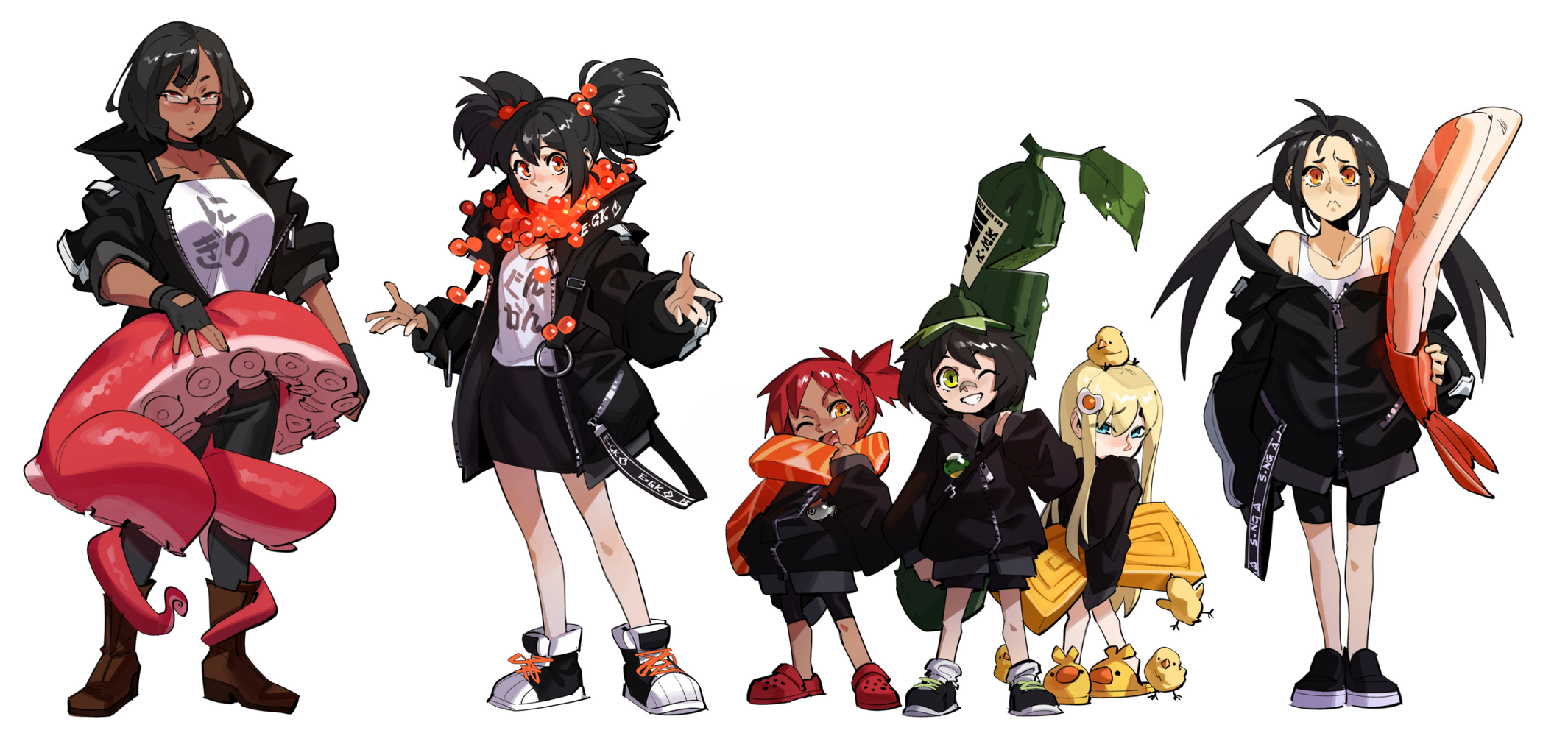 Sushi Gijinka; (gijinka meaning "humanization" in japanese) is a set of characters I designed specifically for my college exihibition (2023). Appearance wise, they are based on... sushi. I really like sushi... and anime character designs! They don't have names yet!