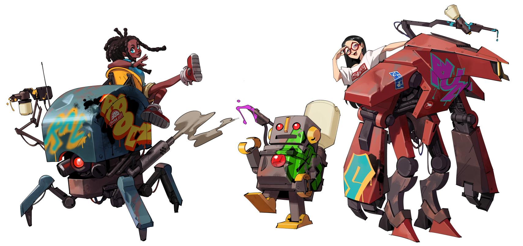 Brook is a set of characters made specifically for my graduation exhibition (2023). I had initially made characters that didn't match in terms of aesthetics, resulting in me making a set of three just to have them wrapped up in a nice package together. Dee (left) and Jin (right) love making robots with whatever scrap they can find!
